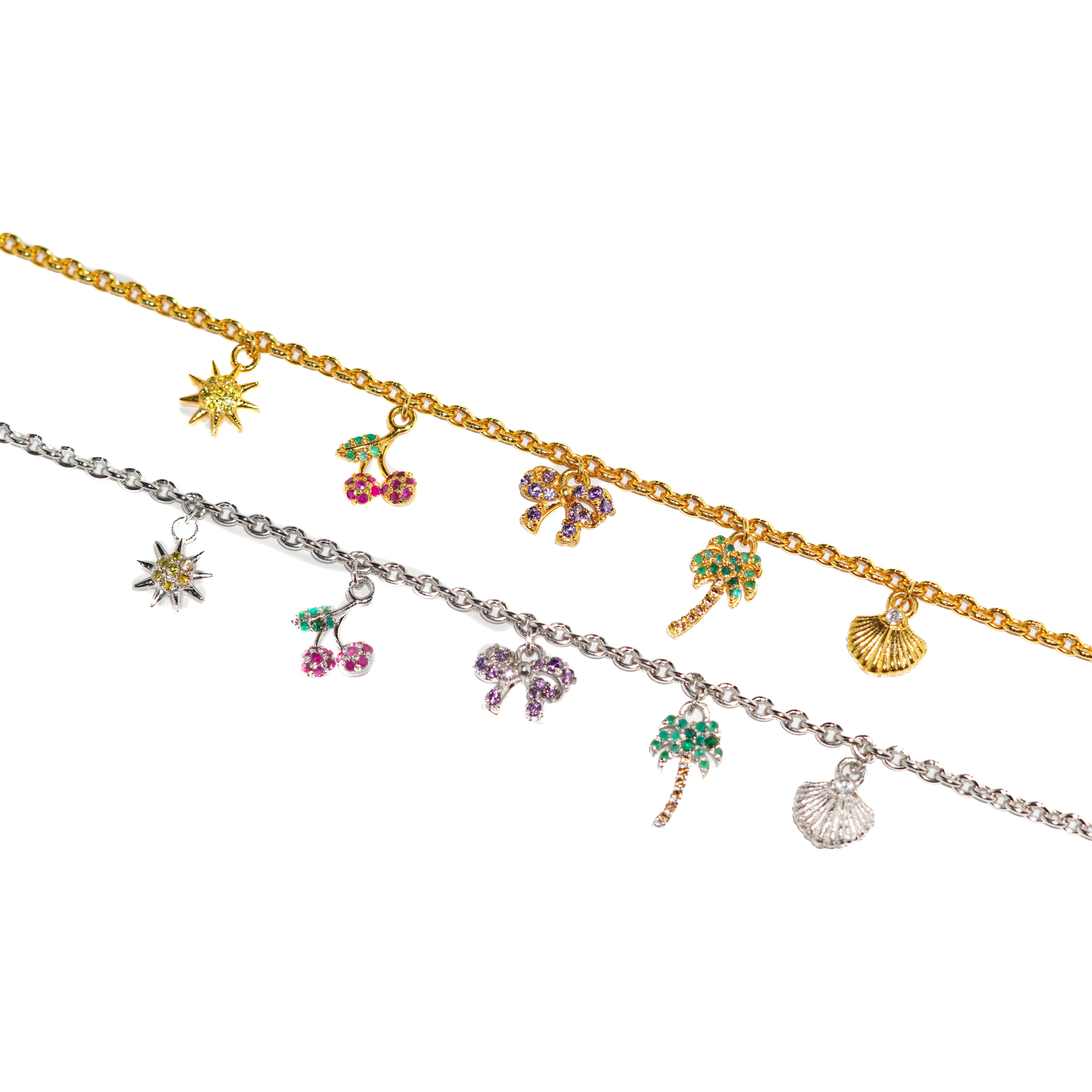 Celebrate your bestfriends in style with the Tropical Charm Bracelet, featuring five uniquely textured charms encrusted with sparkling zirconia. Crafted from fine sterling silver and available in white gold or 21K gold plating, this bracelet radiates vibrant energy β a perfect gift your bridesmaids will adore.