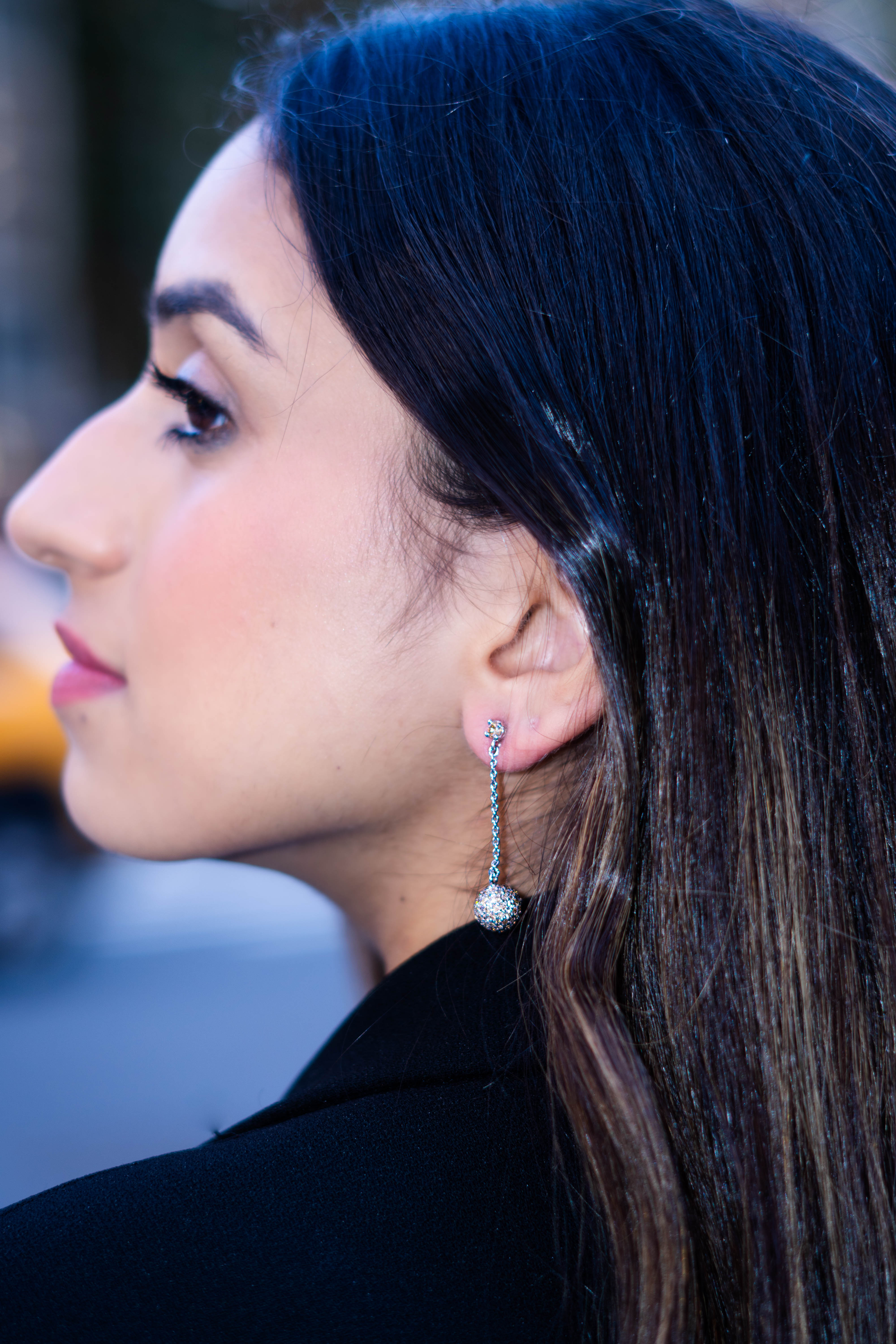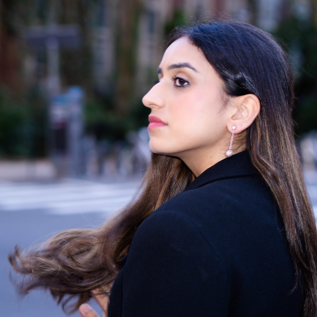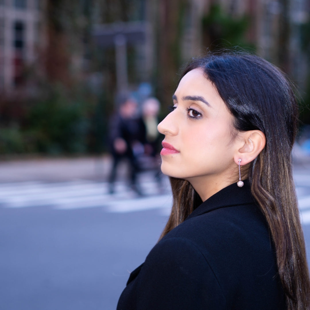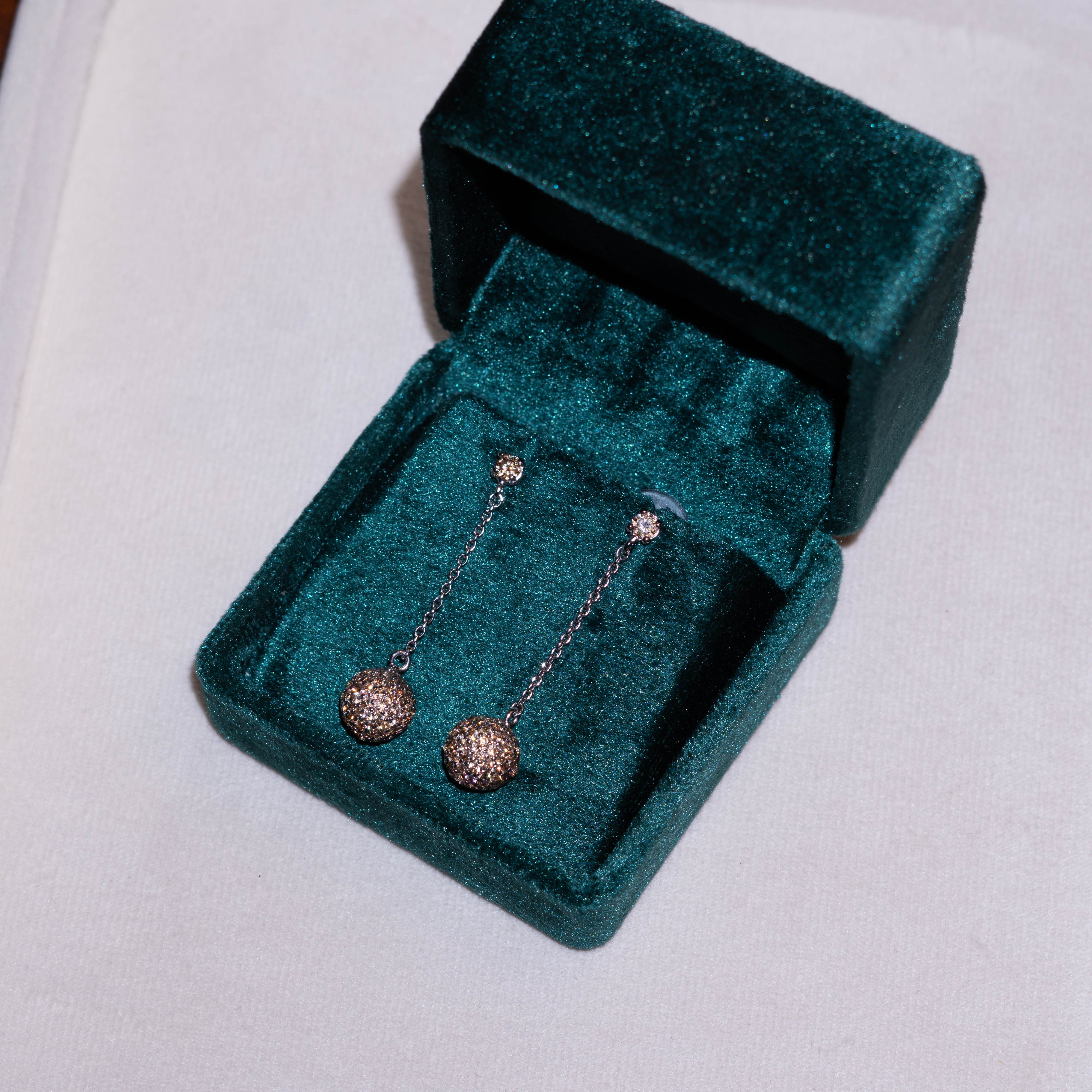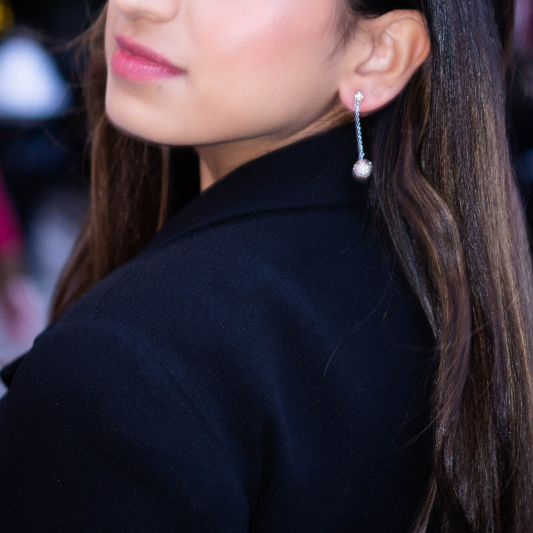 Sophisticated and sparkling, these earrings feature champagne zircon–encrusted spheres dangling from a single stone on a delicate silver chain. Handcrafted in pure silver with white gold plating, they bring effortless glamour to any city girl’s look.