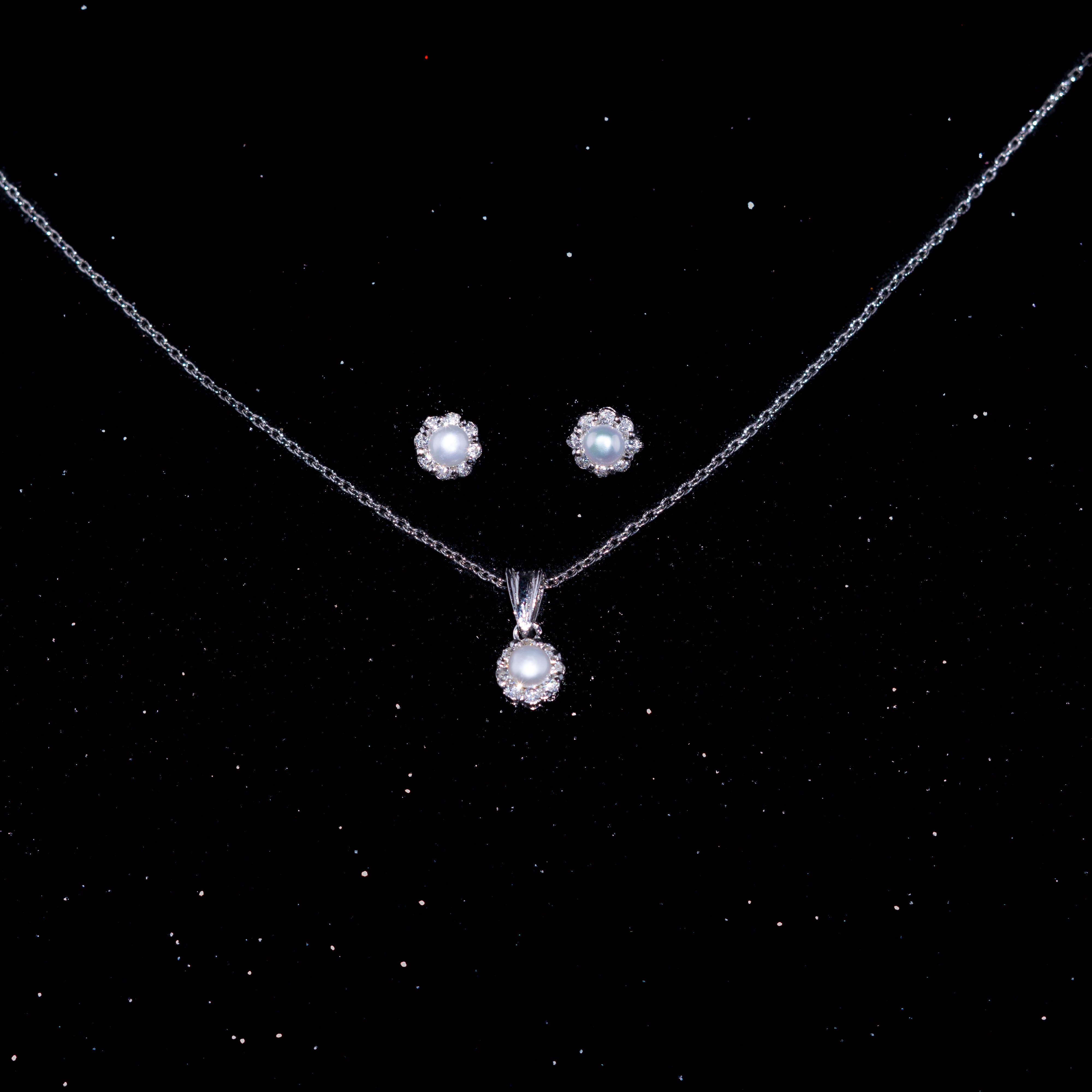 A refined pearl pendant paired with matching pearl studs, accented with delicate white zircons and crafted in pure sterling silver. Designed as a timeless set for effortless everyday elegance — perfect for gifting or elevating daily wear.