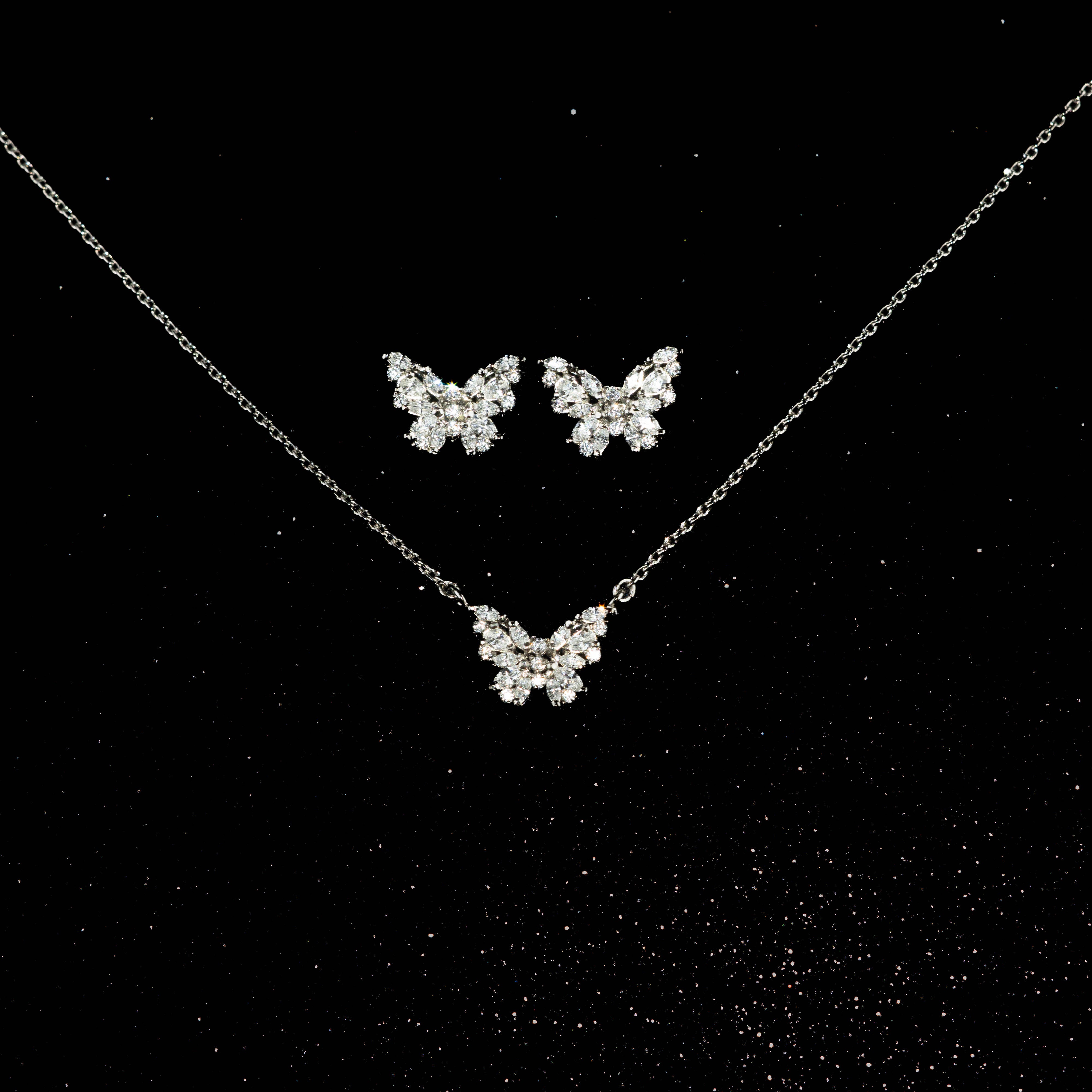 A sparkling butterfly motif brought to life in the Starlet Set, featuring a delicate necklace and matching earrings crafted from clusters of stones that create a dazzling illusion of diamonds. Perfectly designed to shimmer with every movement, this set captures celestial elegance and makes a thoughtful, timeless Eid gift — now available at a special reduced price. Explore more refined collections at our Handmade silver jewelry store, where every design reflects grace and craftsmanship.