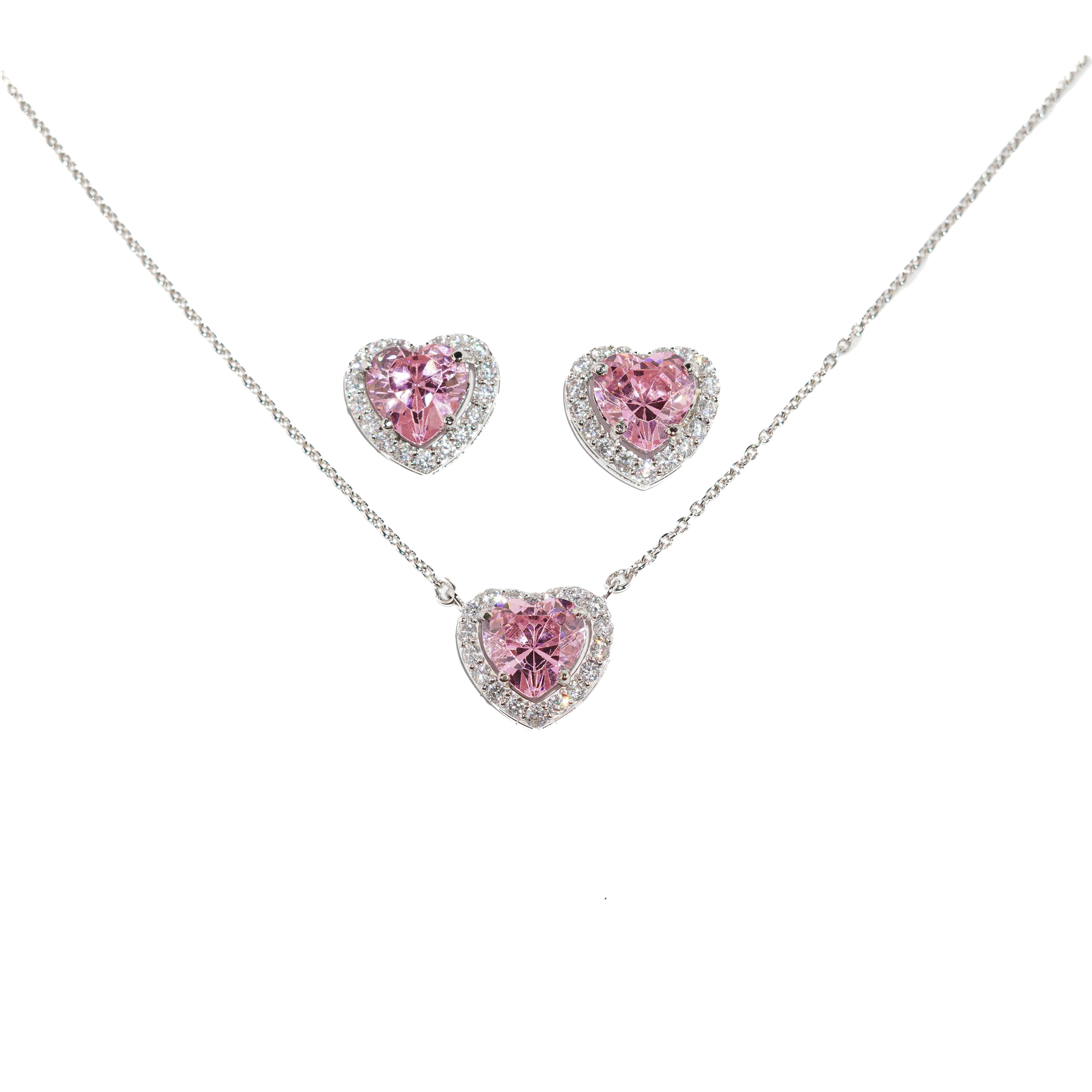 This elegant jewelry set pairs a delicate heart pendant necklace with matching stud earrings, each handcrafted in pure silver and adorned with brilliant pink stones embraced by a halo of sparkling white zirconia. With its romantic design and refined sparkle, this set adds a graceful touch to any look — buy them together at a reduced price.