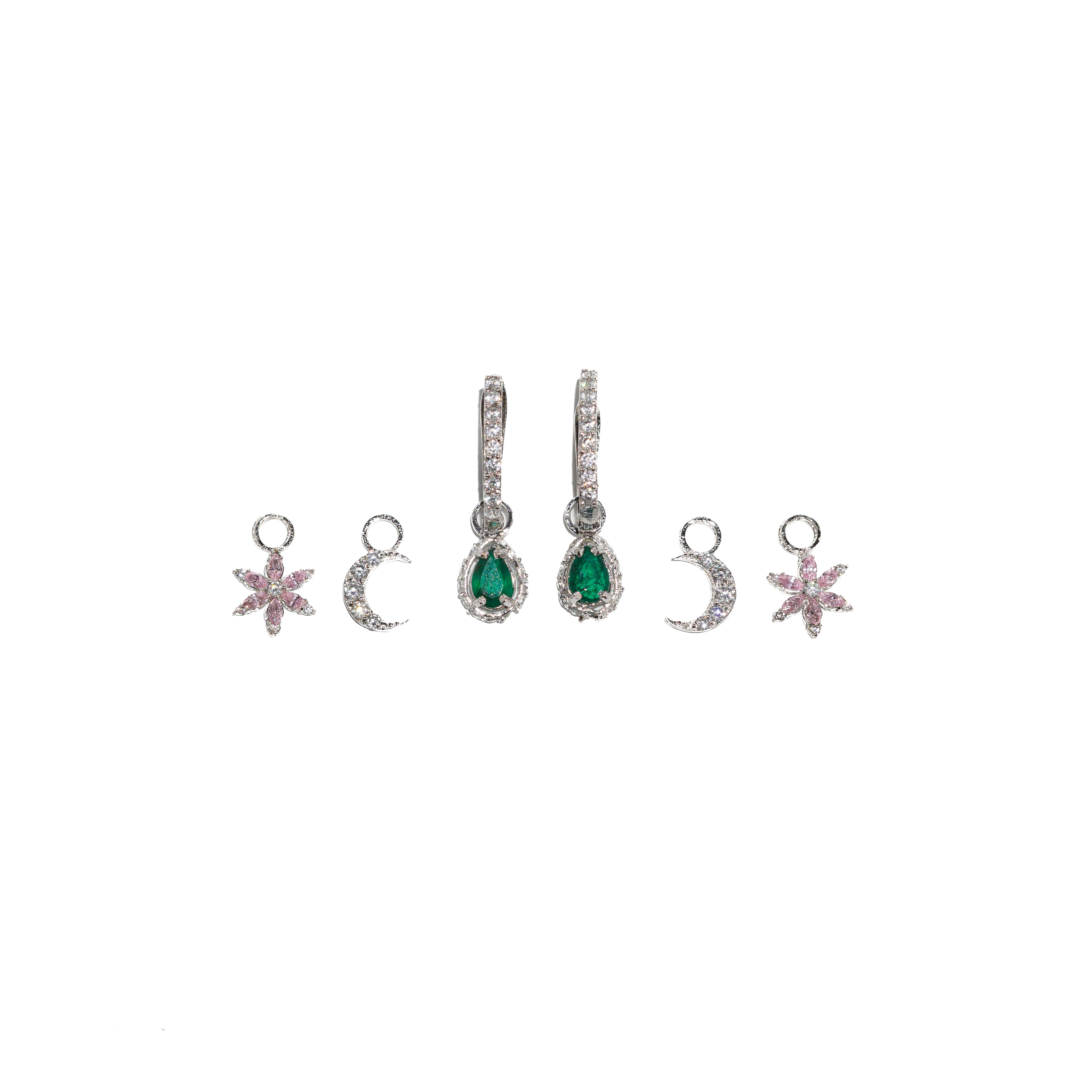 A versatile 3-in-1 pair of hoops featuring interchangeable charms — a semi-precious emerald drop, a delicate pink-and-white zirconia flower, and a shimmering crescent in white zirconia. Style them your way for endless looks, from playful to elegant.